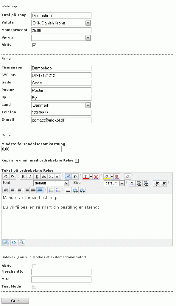 Her vælger du titel på din webshop, ønsket valuta, momsprocent og evt. sprog. Firma oplysningerne udfyldes som ønsket, og har man en betalings gateway kan information til denne udfyldes også.